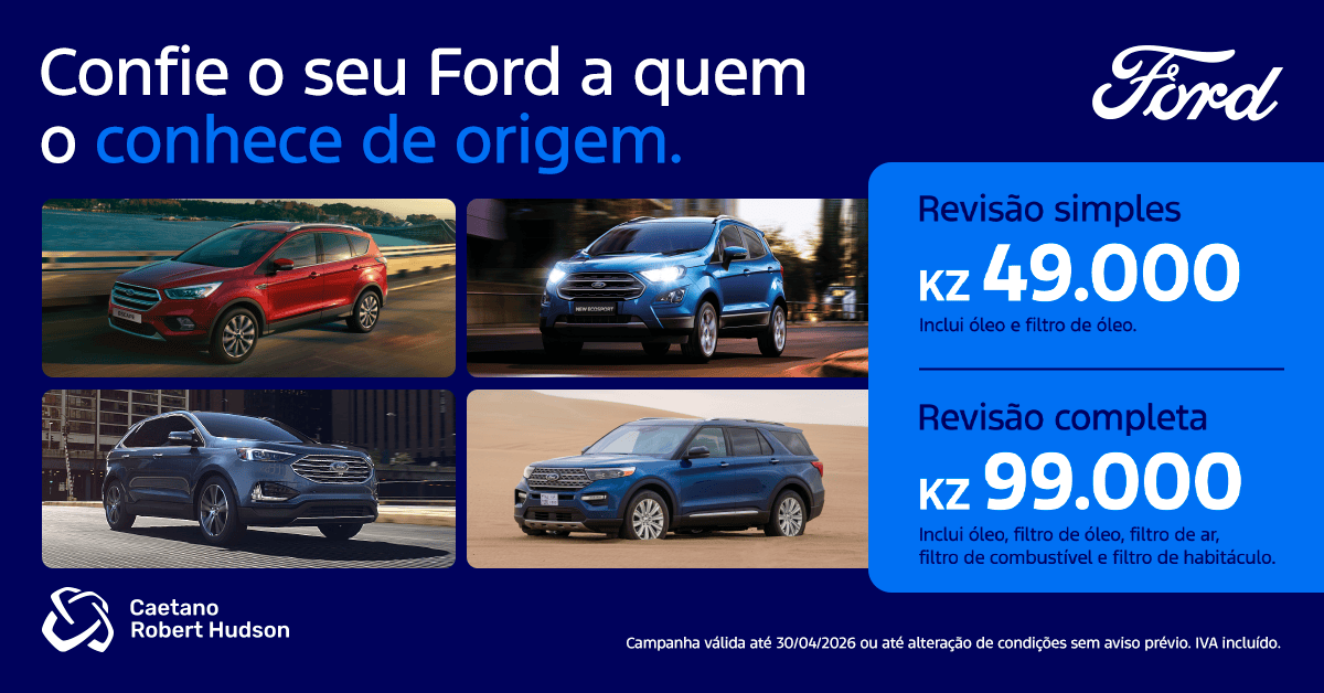 Confie o seu Ford a quem o conhece de origem. A Ford Angola tem campanhas exclusivas de revisões para os modelos Escape, EcoSport, Edge e Explorer, com opções simples e completas a preços acessíveis.